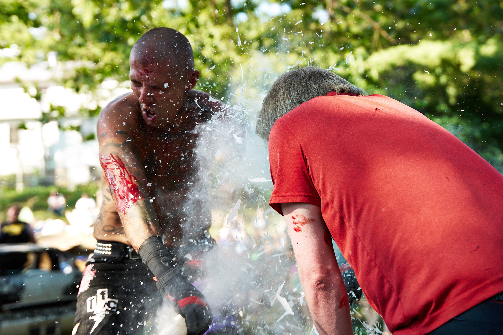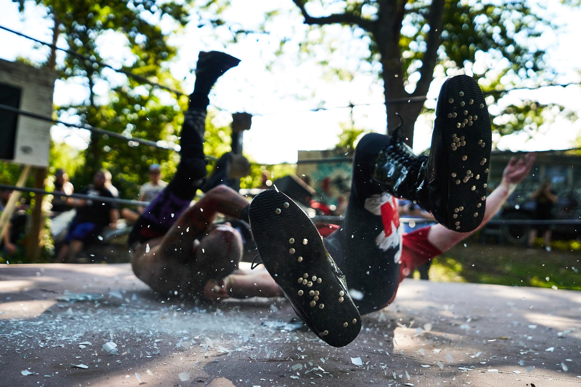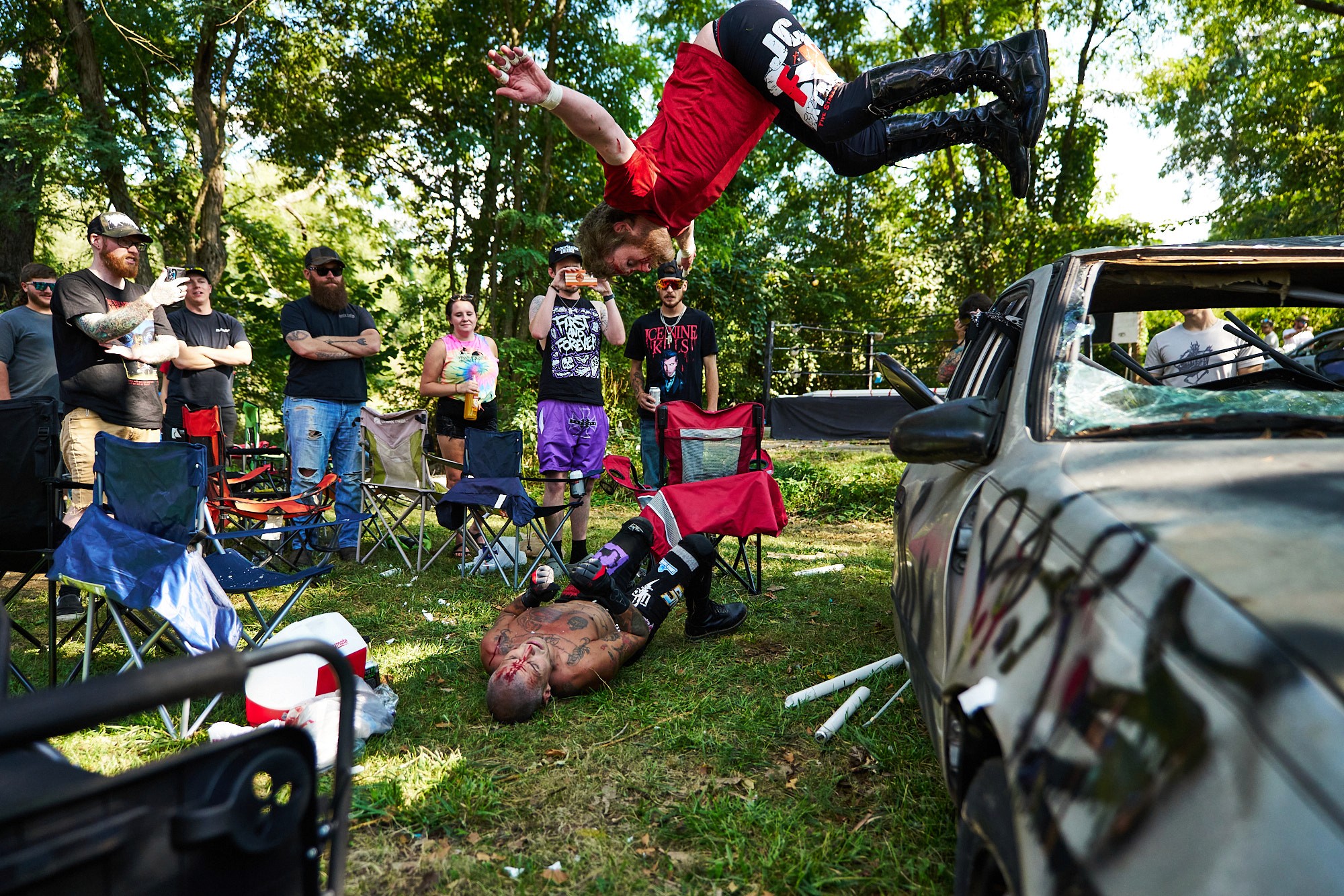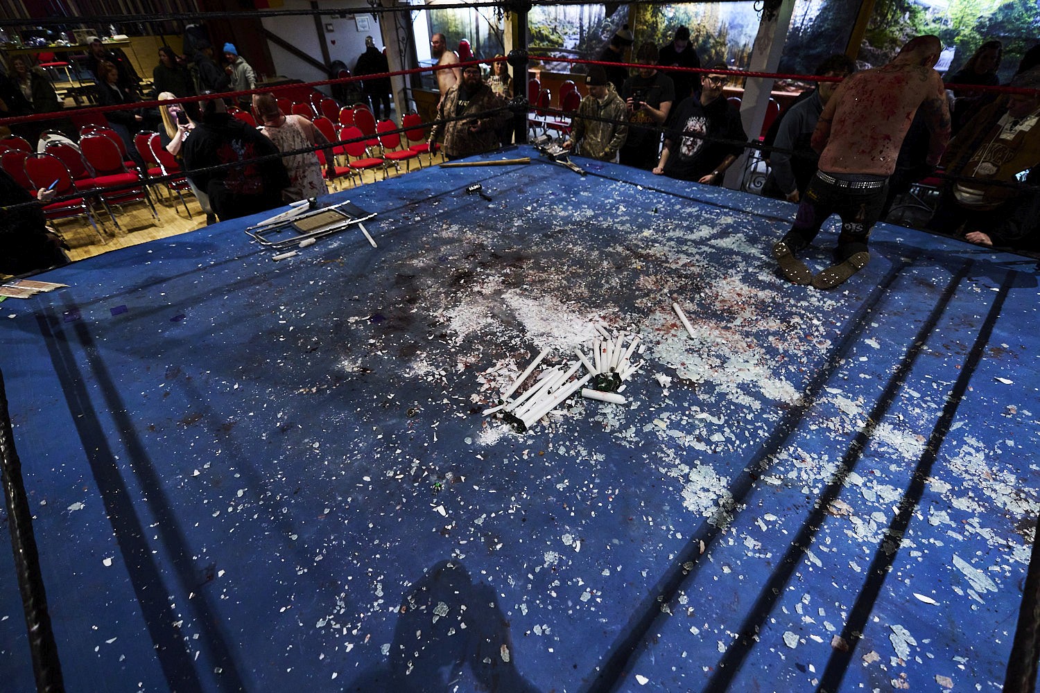 Instead, Greco found a way to merge his love for art with wrestling, creating weapons for his matches. "I enjoy creating things. The fact that I get to be creative with deathmatch, I think satiates all of my needs in life," he says. His creations range from bats covered in razor blades, thumbtacks, or shark teeth, to intricate light tube contraptions.