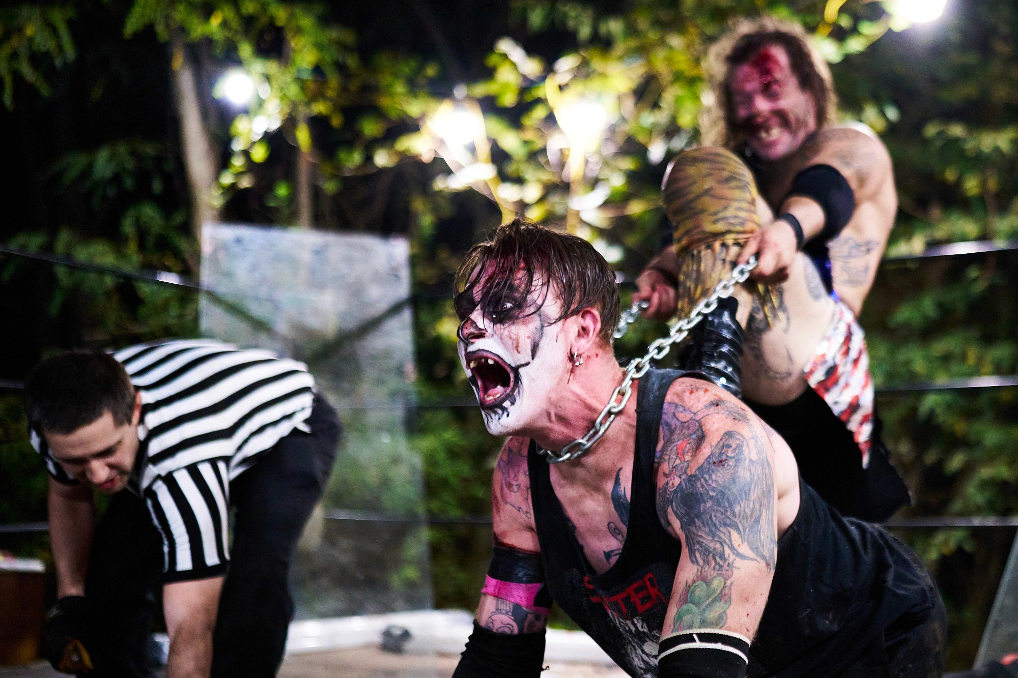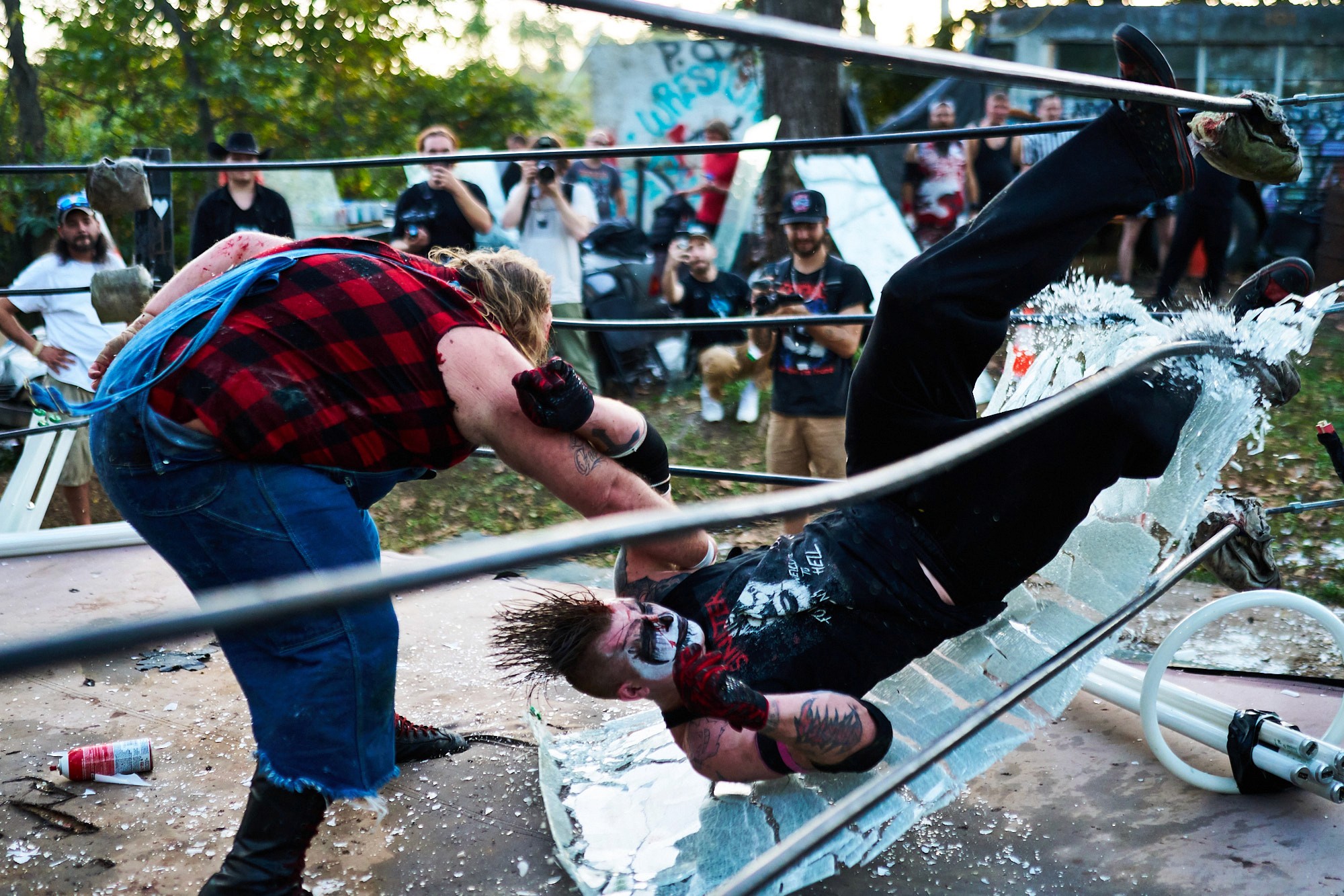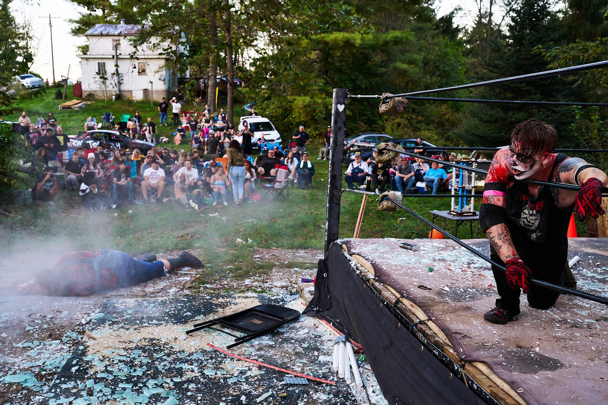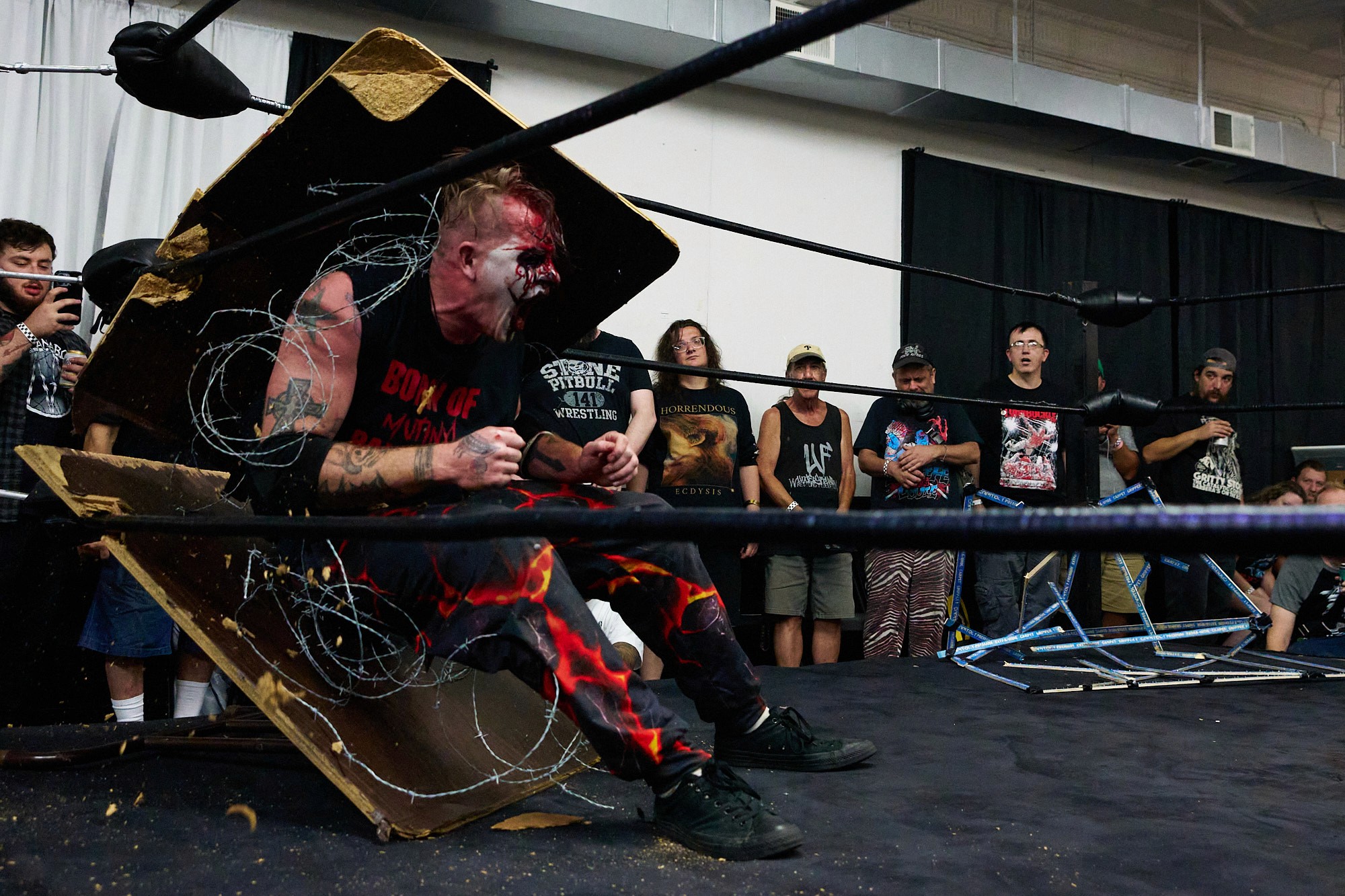 "Sinister is a group effort," Bob emphasizes. His wife, Holly Bradburn, plays a crucial role in bringing the character to life, designing and applying his intricate face paint. “She has been there in ways nobody else has, she is my rock, she is a big part of Sinister, she is the facepaint, the creativity.” As a founding member of Profits of Regret (POR), a Virginia-based wrestling promotion known for its extreme and dangerous stunts, Bob has carved out a unique space in the wrestling world. Wrestling is not without its challenges. The physical toll of deathmatches can strain their relationship, as injuries sometimes affect Bob’s ability to work and provide for their family.