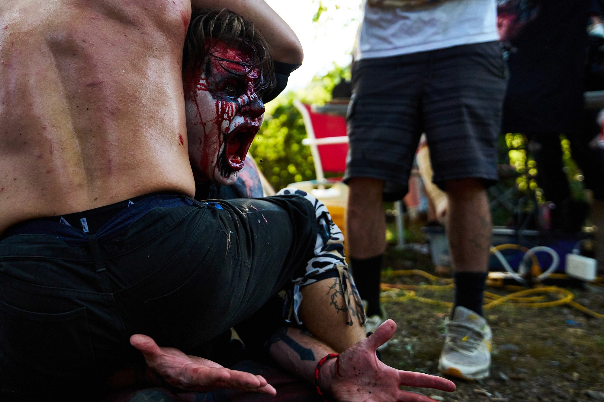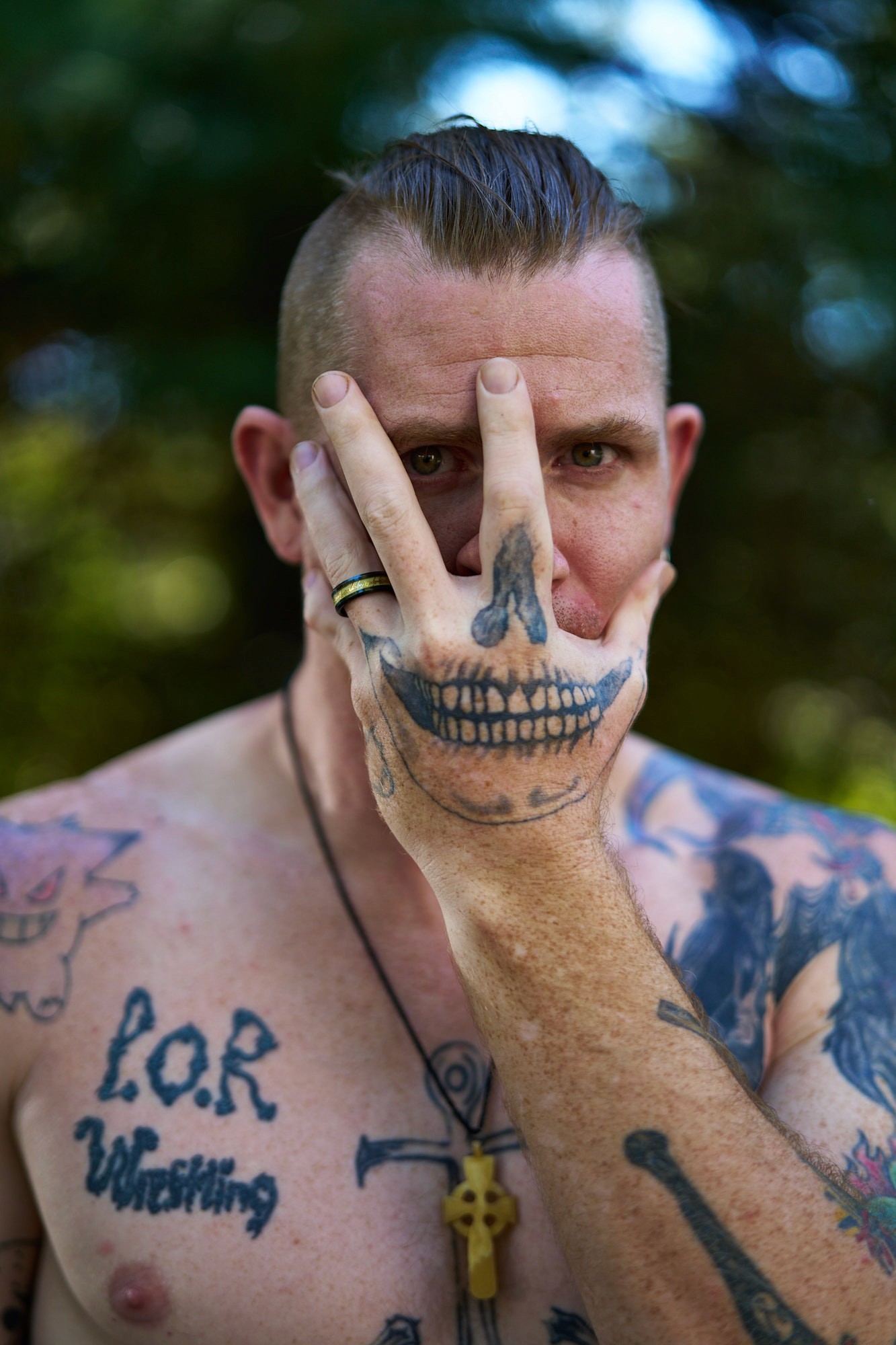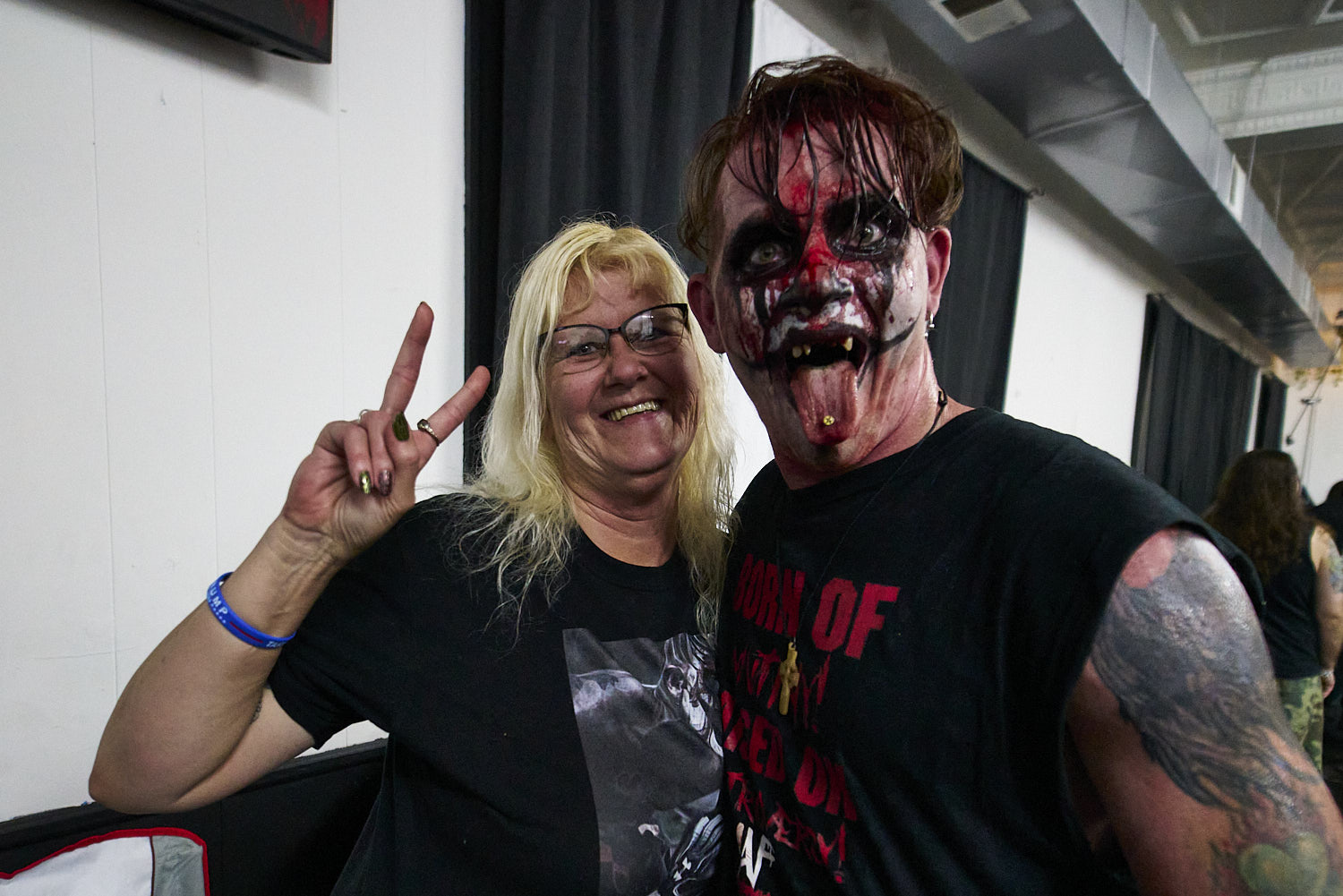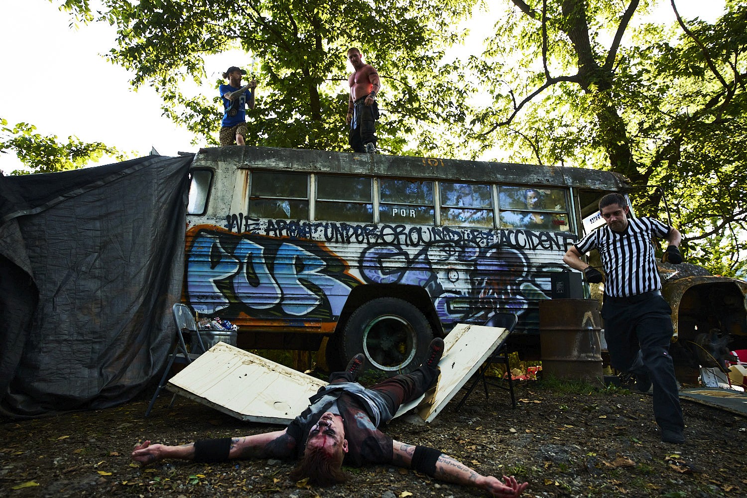 "Sinister is a group effort," Bob emphasizes. His wife, Holly Bradburn, plays a crucial role in bringing the character to life, designing and applying his intricate face paint. “She has been there in ways nobody else has, she is my rock, she is a big part of Sinister, she is the facepaint, the creativity.” As a founding member of Profits of Regret (POR), a Virginia-based wrestling promotion known for its extreme and dangerous stunts, Bob has carved out a unique space in the wrestling world. Wrestling is not without its challenges. The physical toll of deathmatches can strain their relationship, as injuries sometimes affect Bob’s ability to work and provide for their family.